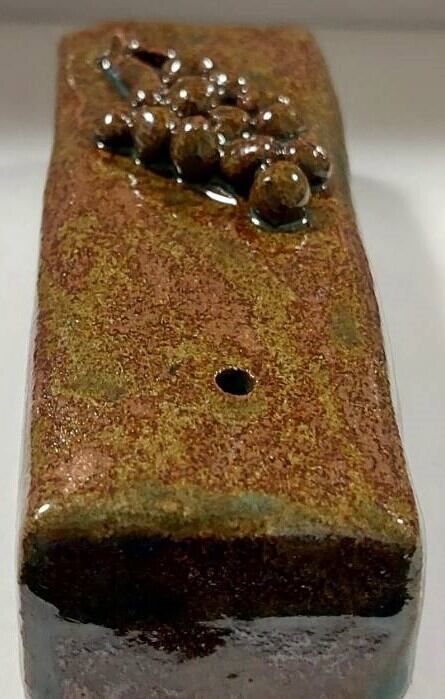荒金節子さんが製作した陶器の水差しです。大きさは縦3㎝、横8.5㎝、高さ約2㎝です。上には長さ4㎝、幅2㎝くらいのブドウが乗っています。