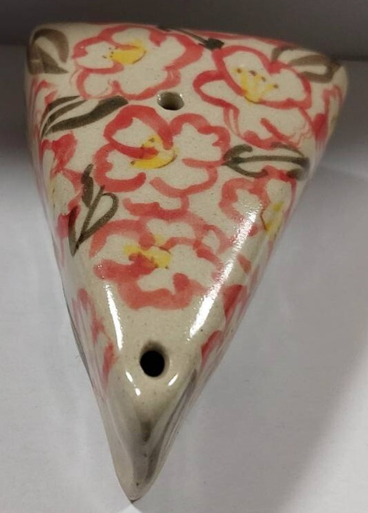 荒金節子さんが製作した花柄の陶器の水差しです。高さ約3㎝で、上から見ると6㎝、8.5㎝、8.5㎝の三角形になっています。